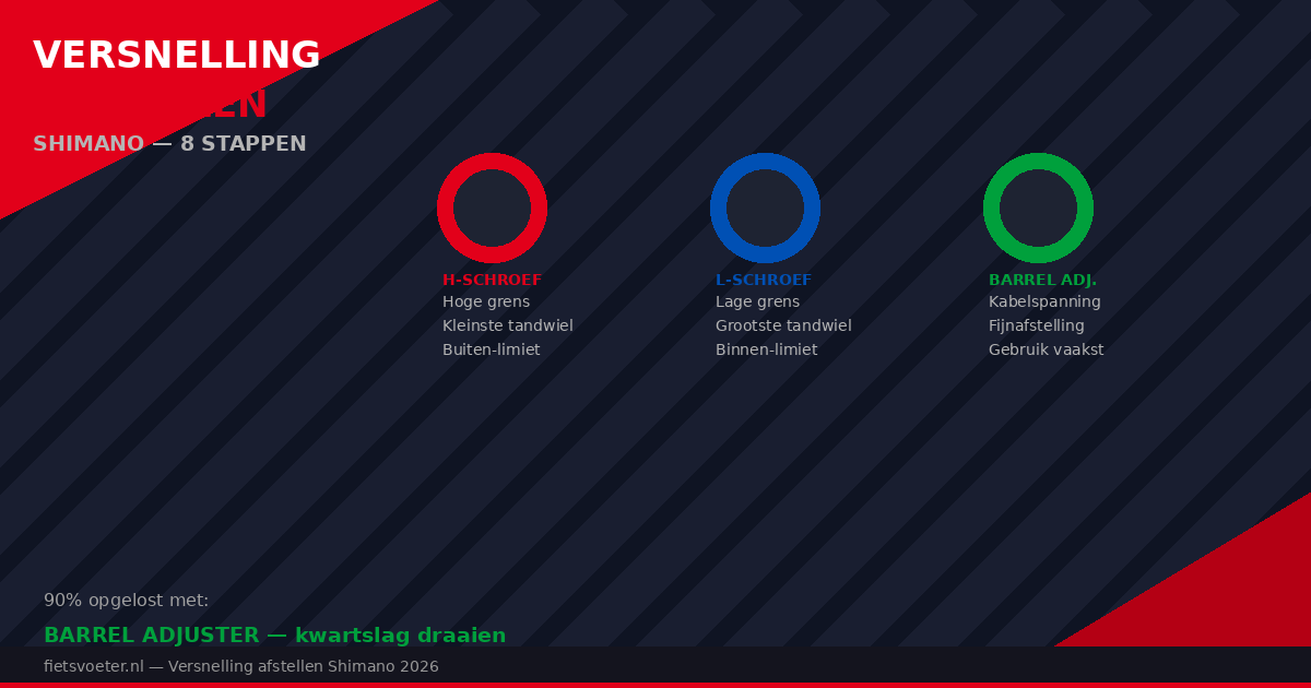 Een ratelende ketting, een versnelling die niet soepel doorschakelt. Heb je ook last van piepende remmen? Dat en schakelrobleme hebben dezelfde oorzaak — verwaarloosd onderhoud. Een complete fiets onderhoud gids helpt je beide te voorkomen. of een ketting die overslaat op de cassette — dit zijn de drie klassieke tekenen dat je derailleur afgesteld moet worden. In 90 procent van de gevallen is het probleem opgelost met twee kleine aanpassingen: de barrel adjuster draaien en eventueel de H- of L-stelschroef corrigeren. Je hebt daarvoor geen fietsenmaker nodig, geen speciaal gereedschap en geen ervaring als monteur.