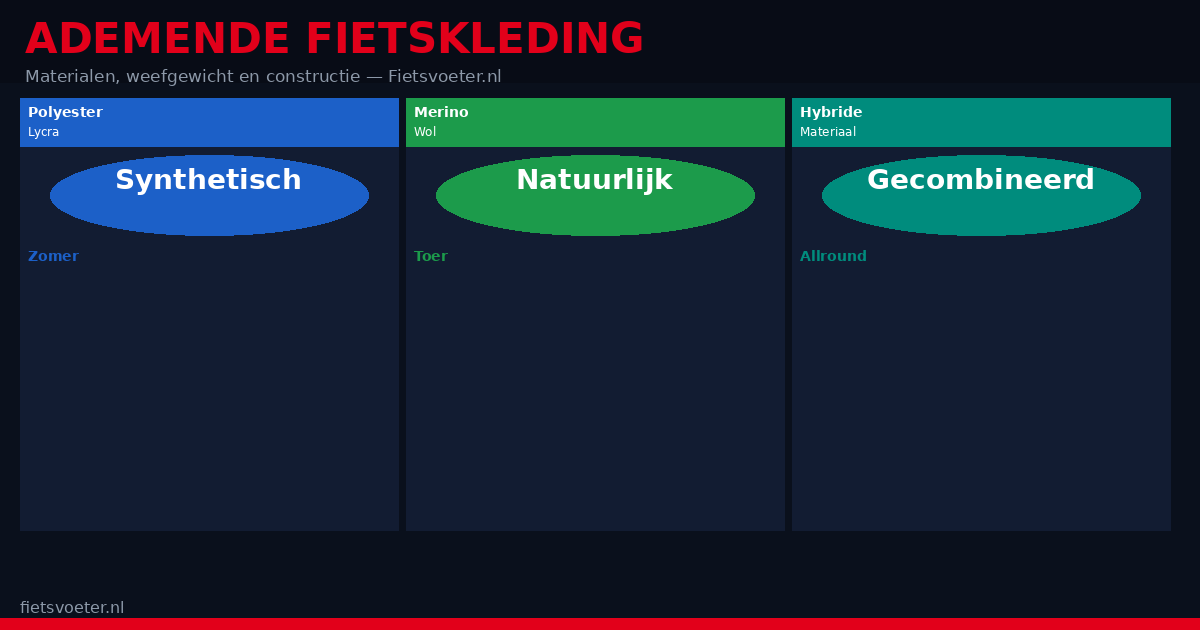 Modern fietskleding combineert synthetisch en merino in één stuk. Typisch: synthetisch aan de voorkant voor wind- en slijtagebestendigheid, merino aan de achterkant en oksels voor temperatuurregulatie. Dit geeft het beste van beide werelden voor toerrijders.
