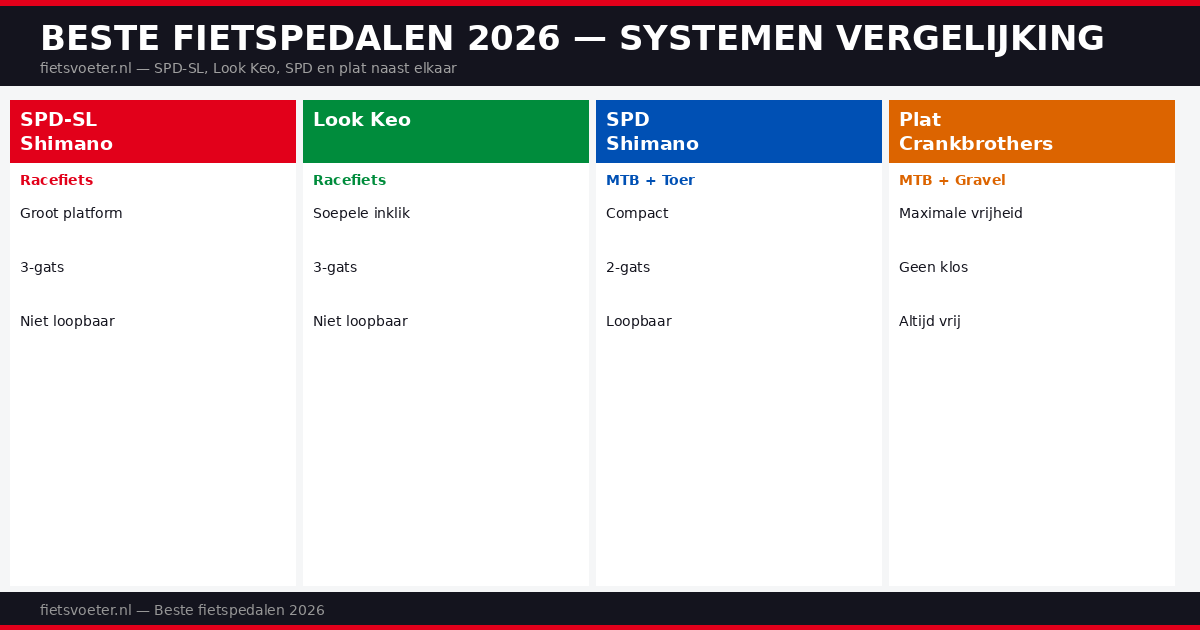 De keuze voor de juiste pedalen is afhankelijk van je fietstype en rijstijl. Voor racefietsen zijn Shimano SPD-SL en Look Keo de standaarden. Voor MTB is Shimano SPD het meest gebruikte systeem. Voor beginners en MTB-rijders die veiligheid boven efficiëntie stellen zijn goede platte pedalen een uitstekende keuze.