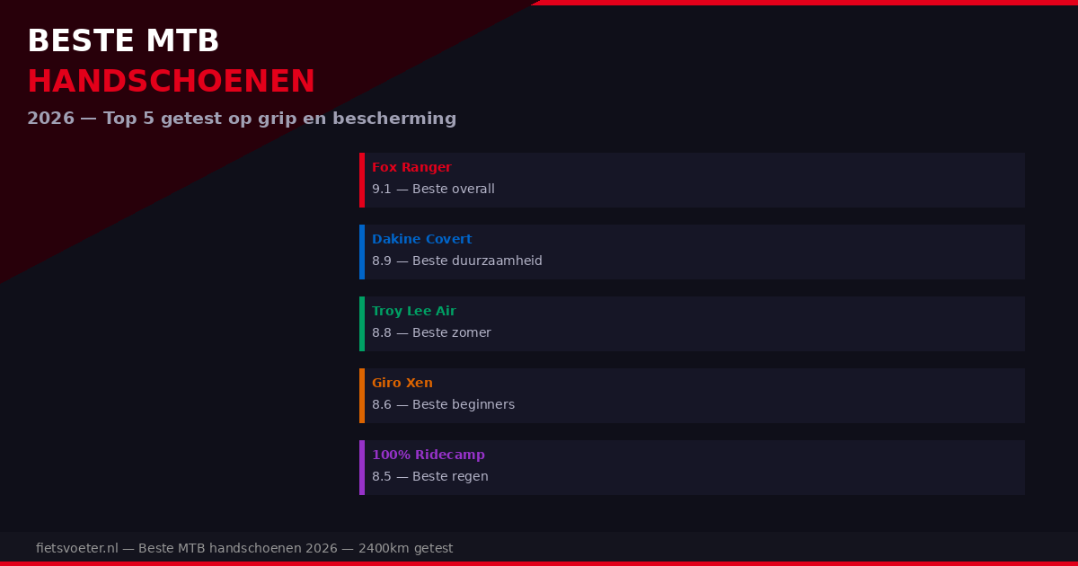 De beste MTB handschoenen van 2026 zijn de Fox Ranger — uitstekende grip door de Clarino palm, goede vingerbeweeglijkheid en duurzaam genoeg voor seizoenen van intensief trail rijden. Maar voor rijders die maximale bescherming willen zijn de Troy Lee Designs A3 de betere keuze.