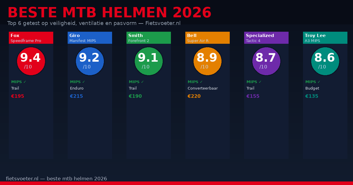 Een MTB helm is het enige stuk uitrusting dat er echt toe doet als het misgaat. Niet de fiets, niet de schoenen — de helm. Toch kopen veel mountainbikers hun helm op prijs of uiterlijk, zonder te weten wat MIPS doet, waarom ventilatie bij klimmen cruciaal is of hoe een helm eigenlijk beschermt bij een val. Wij reden zes helmen uitgebreid op trail en enduro-terrein in de Ardennen en op de Posbank en geven je een eerlijk oordeel op de punten die er echt toe doen.