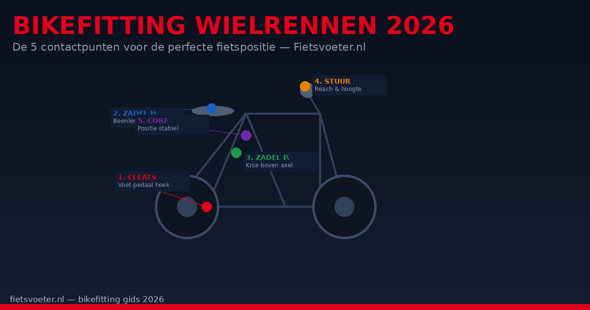 Een perfecte fietspositie is geen luxe voor professionele wielrenners — het is de basis van elk goed fietsseizoen. Een verkeerde zadelhoogte van slechts 5 millimeter kost je meetbaar vermogen en geeft op lange termijn kniepijn. Een te ver vooruitgeschoven zadel belast je knieën verkeerd. Een stuur dat te laag staat geeft rugpijn. De meeste wielrenners rijden jarenlang in een suboptimale positie zonder te weten dat het beter kan. Bikefitting — het systematisch instellen van alle contactpunten op de fiets — is de goedkoopste en meest effectieve prestatieverbetering die bestaat.