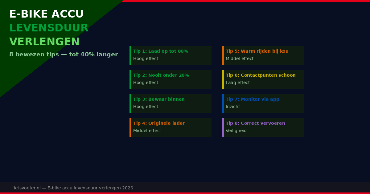 Deze gids geeft acht concrete, wetenschappelijk onderbouwde tips die je direct kunt toepassen — ongeacht of je een Bosch, Shimano Steps, Yamaha of ander accusysteem hebt.