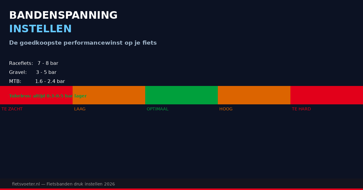 De juiste bandenspanning is niet één getal — het hangt af van je lichaamsgewicht, de bandenmaat, het bandentype (tubeless of binnenband) en de rijomstandigheid. In deze gids geven we exacte waarden per situatie.