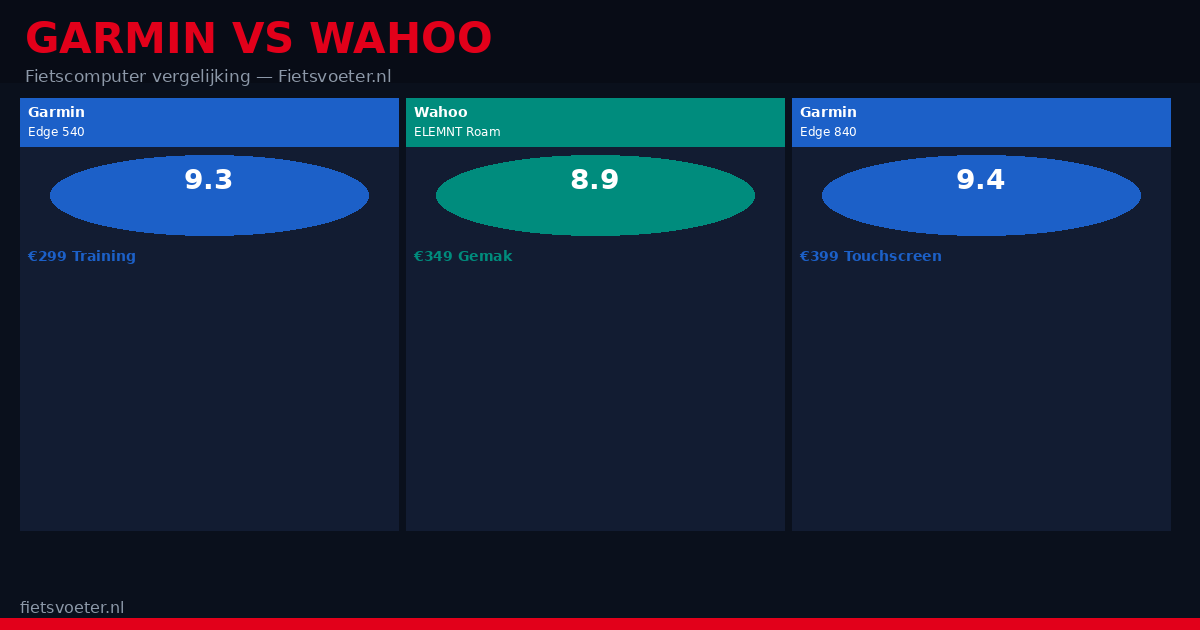 | Model | Prijs | |-------|-------| | Wahoo ELEMNT Bolt V2 | €219 | | Garmin Edge 540 | €299 | | Wahoo ELEMNT Roam 2 | €349 | | Garmin Edge 840 | €399 |