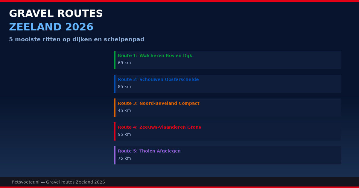 Zeeland is voor gravelrijders wat de Alpen zijn voor wielrenners — een bestemming die je minstens één keer gereden moet hebben. Niet vanwege klimmen (die zijn er nauwelijks) maar vanwege de unieke combinatie van dijkpaden met weids uitzicht, schelpenpadjes door de polders en de constante aanwezigheid van water aan beide zijden van het eiland. De vijf routes in deze gids geven je alles van 45 tot 120 kilometer gravel op de mooiste Zeeuwse eilanden.