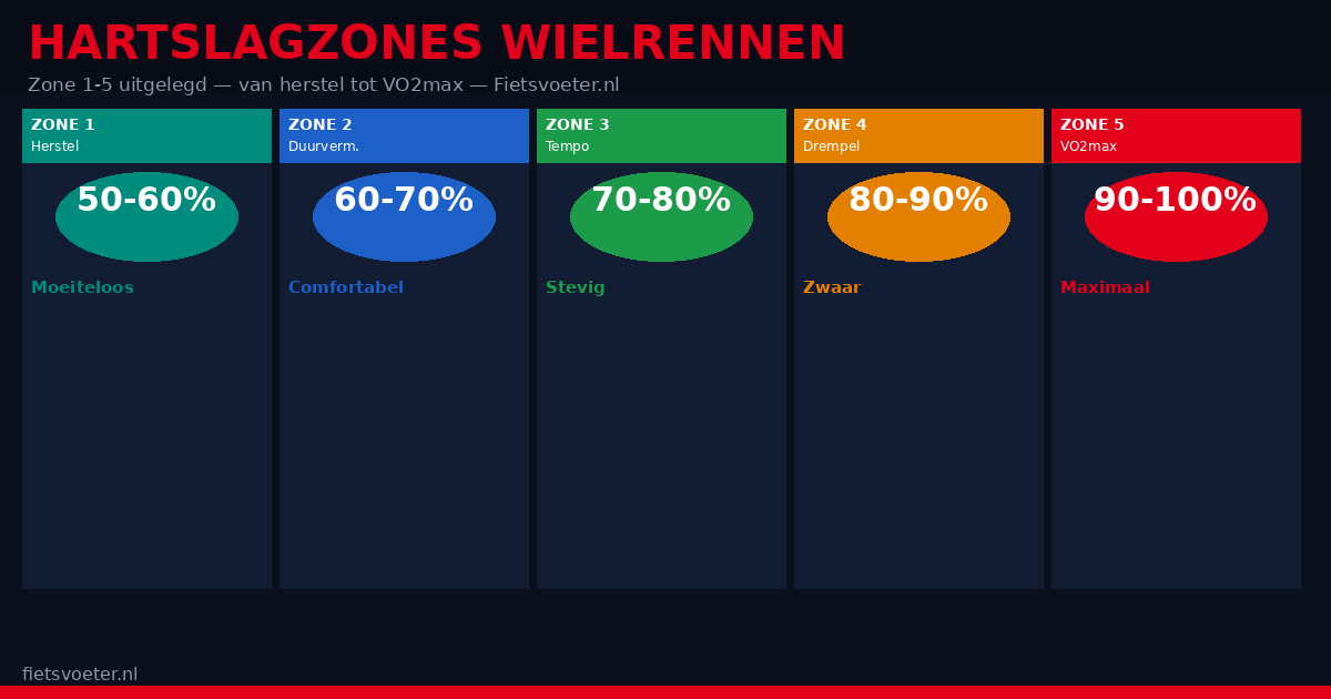 Zone 5 is kort en fel. Bij 90-100% HRmax rijd je aan de bovengrens van je aerobe capaciteit. De intervallen zijn te kort om de hartslag volledig op te laten lopen. in de praktijk bereik je zone 5 pas in de laatste minuut van een 4-5 minuten durend interval.