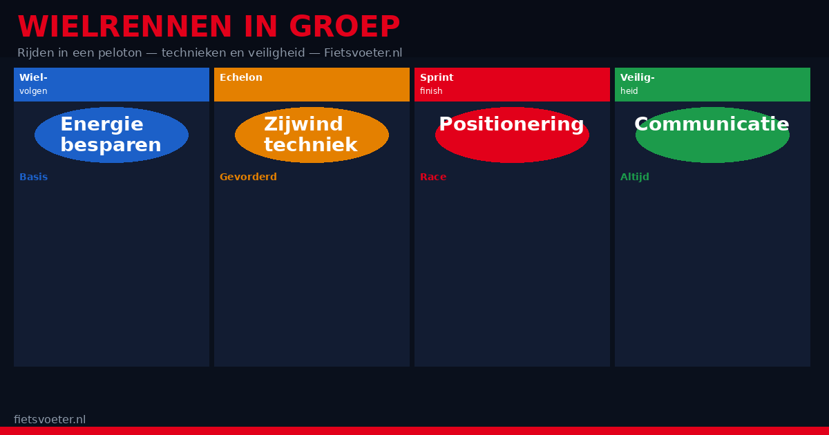 In een goed rijdend peloton is fietsen een bijna magische ervaring. Twintig of dertig mensen rijden op 35 km/u, de wielafstand is vijftig centimeter en toch voelt het stabiel en ontspannen. De luchtweerstand is met 25 tot 35 procent gereduceerd — een wielrenner die goed wiel rijdt kan dezelfde snelheid houden als een solo rijder terwijl hij slechts 60 tot 70 procent van het vermogen levert. Maar groepsrijden is een vaardigheid die je moet leren. De techniek, de communicatie en de ongeschreven etiquette zijn niet aangeboren — ze worden geleerd door ervaring en observatie. Deze gids geeft je de basis.