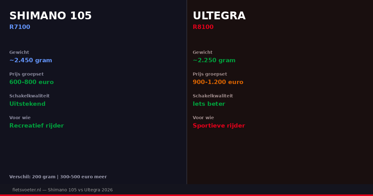 Shimano 105 of Ultegra — het is de meest gestelde vraag bij de aankoop van een racefiets tussen 2.000 en 4.000 euro. Het eerlijke antwoord: voor 90 procent van de recreatieve wielrenners is Shimano 105 R7100 volledig voldoende. Ultegra R8100 is lichter, iets soepeler en heeft betere materiaalafwerking — maar op de fiets voelt het verschil minimaal bij ritten onder 4 uur en inspanning onder 300 watt.