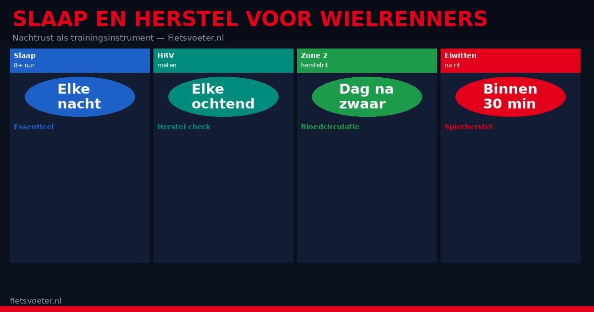 Er is één trainingsinterventie die gratis is, geen uitrusting vereist en meer effect heeft op prestaties dan de meeste supplementen en trainingsschema's gecombineerd: consistent 7-9 uur per nacht slapen. Toch is slaap het meest verwaarloosde herstelgereedschap van wielrenners. Terwijl ze uren besteden aan voedingsplanning en intervaltraining, snijden ze bewust of onbewust in hun slaap. Het resultaat is training die niet aanslaat, verhoogd blessurerisico en stagnerende prestaties.