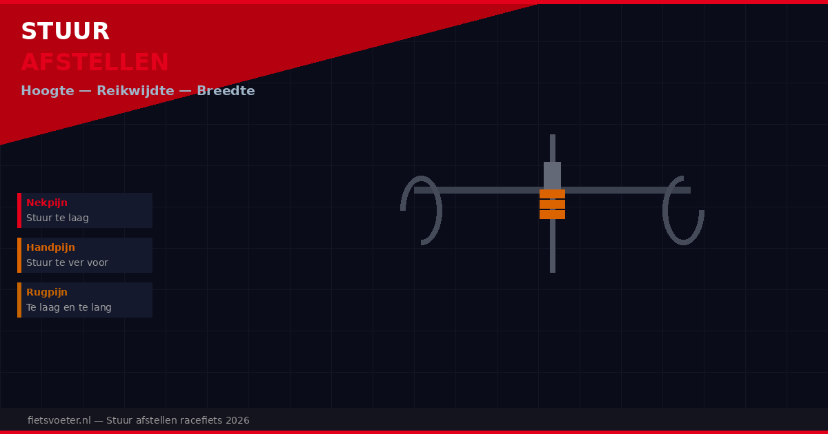 Dit artikel behandelt alle drie de dimensies van stuurafstelling: hoogte via spacers en stuurpenhoek, voor-achter positie via stuurpenlengte, en de juiste stuurbreedte voor jouw lichaamsbouw.