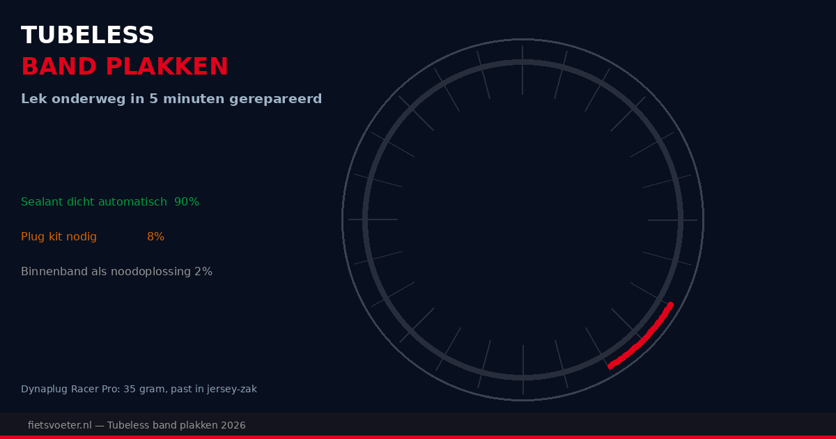 Het grote voordeel van tubeless rijden is precies dit: de sealant in je band dicht kleine lekken automatisch terwijl je doorrijdt. Een spijker, glasscherf of scherp steentje — je merkt het nauwelijks. Maar wat als het gat groter is dan de sealant kan opvullen? Dan heb je een plug kit nodig. Met de juiste gereedschappen en kennis repareer je een tubeless lek in 5 minuten onderweg, zonder de band van de velg te halen.
