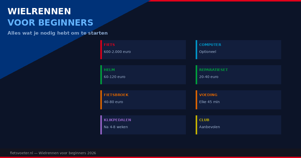 Voor een verantwoorde start heb je minimaal 600 tot 800 euro nodig voor een nieuwe racefiets. Onder dit bedrag zijn de componenten te basic voor plezierig wielrennen. Tweedehands kan ook — een goede tweedehands racefiets van 3 tot 5 jaar oud voor 400 tot 600 euro is een uitstekende startoptie.