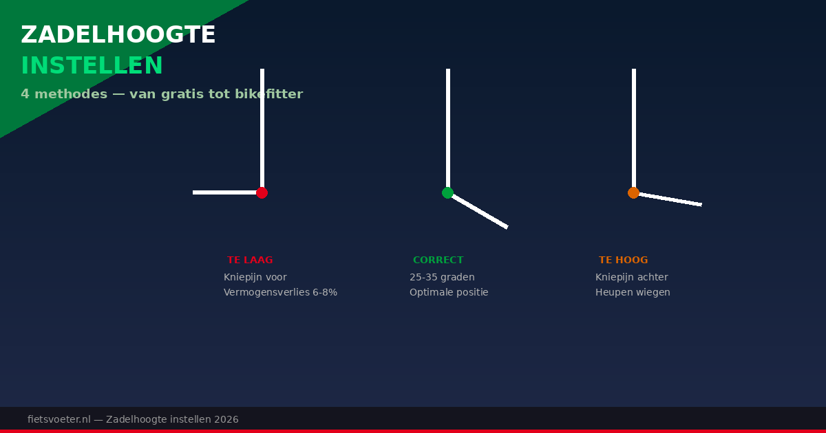 Een verkeerde zadelhoogte is de meest voorkomende oorzaak van kniepijn bij fietsers en tegelijkertijd de meest verwaarloosde afstelling. Te laag: je verliest 6 tot 8 procent vermogen en krijgt pijn voor aan de knie. Te hoog: je heupen wiegen bij elke trapbeweging en je krijgt pijn achter aan de knie of aan de achterkant van de dij. De perfecte hoogte zit er precies tussenin — en het vinden ervan kost 10 minuten.